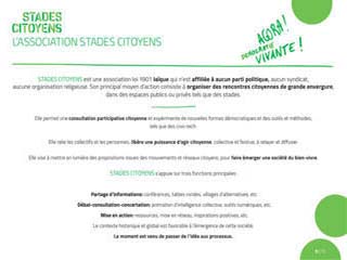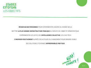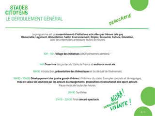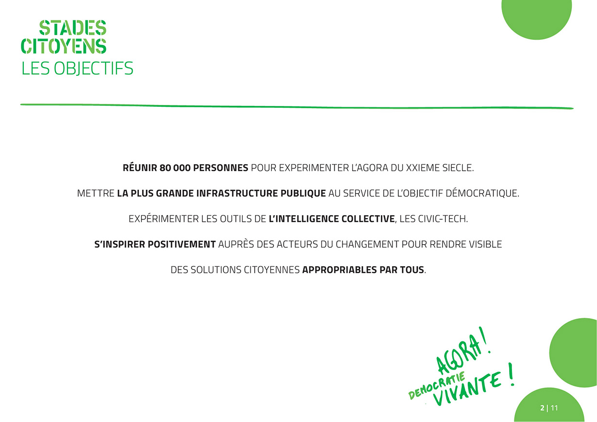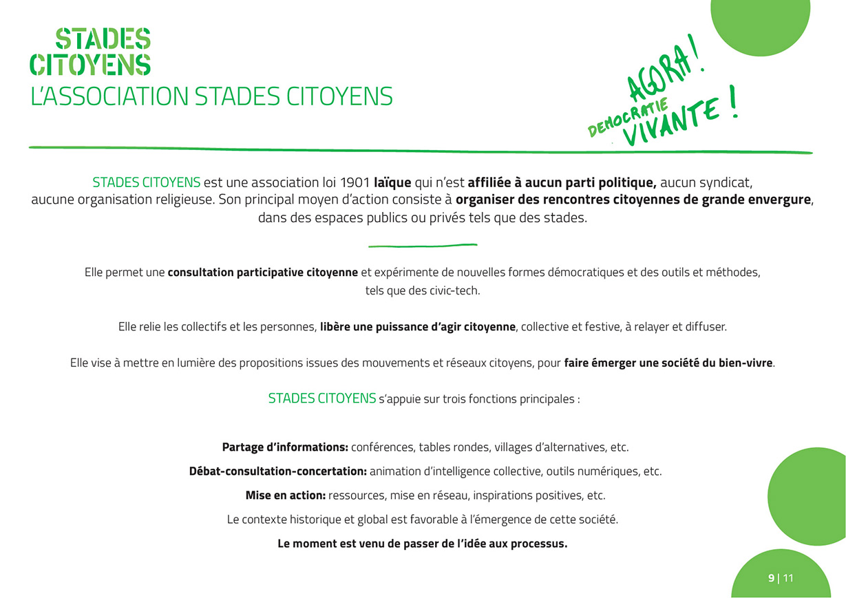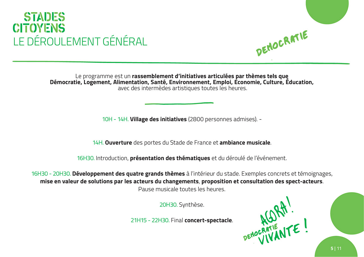 Une agora géante au Stade de France, et un village des initiatives présentant des témoignages inspirants, notamment sur des expérimentations démocratiques et des solutions citoyennes facilement appropriables, ponctués par des interventions artistiques, autour de 4 questions principales :